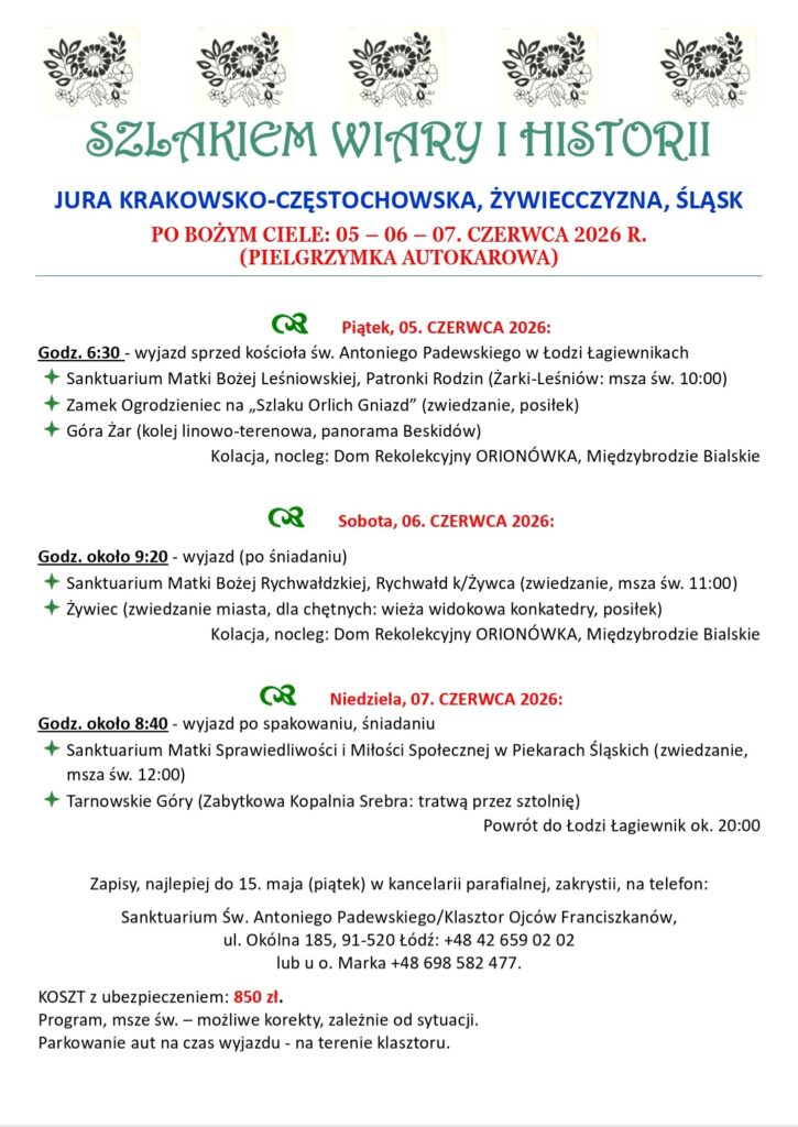 * Zapisy: Najlepiej do 15 maja (piątek). Miejs­ca moż­na rez­er­wować w kance­larii parafi­al­nej, w zakrys­tii po Mszach Świę­tych lub tele­fon­icznie.